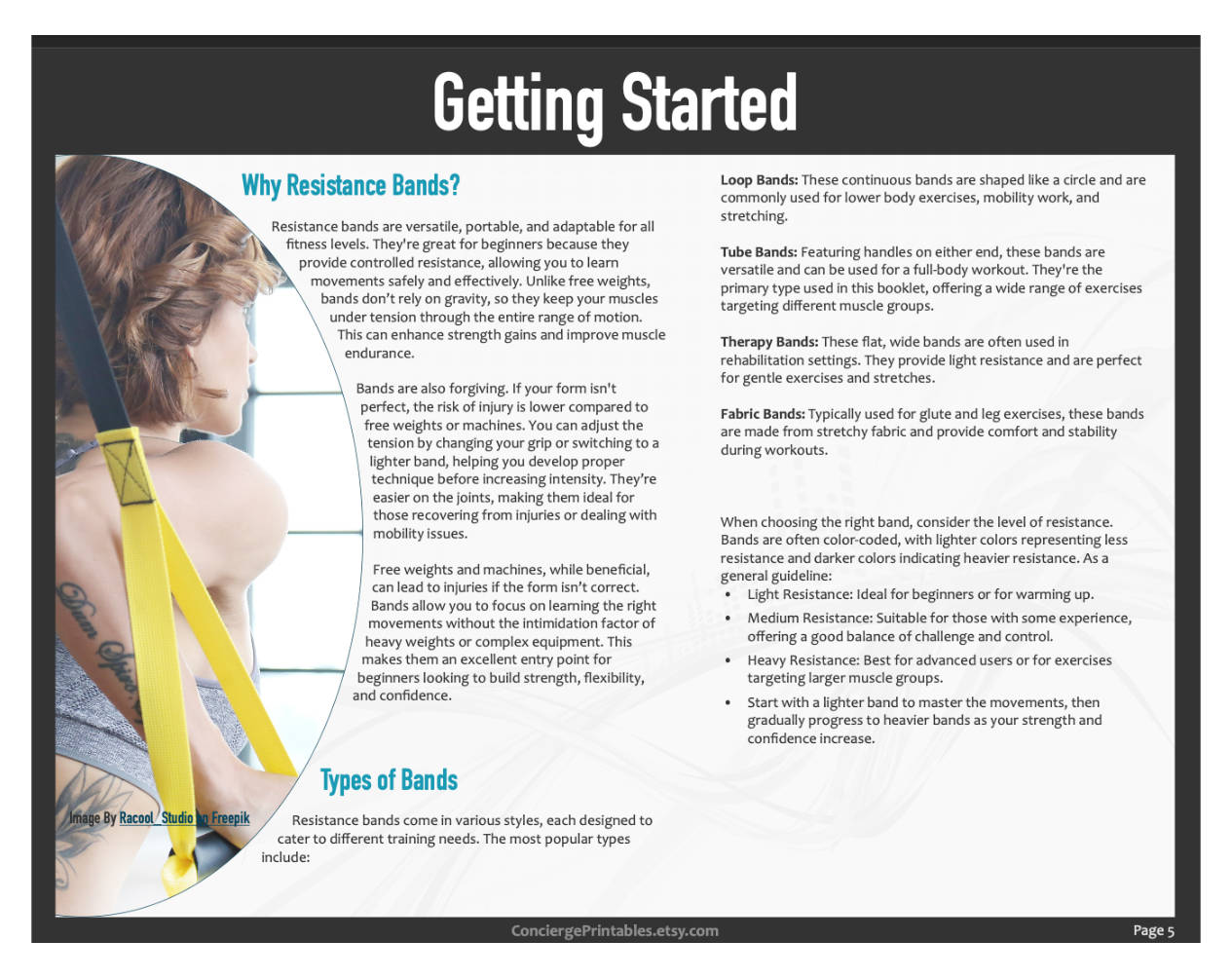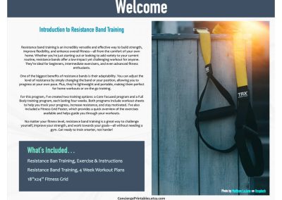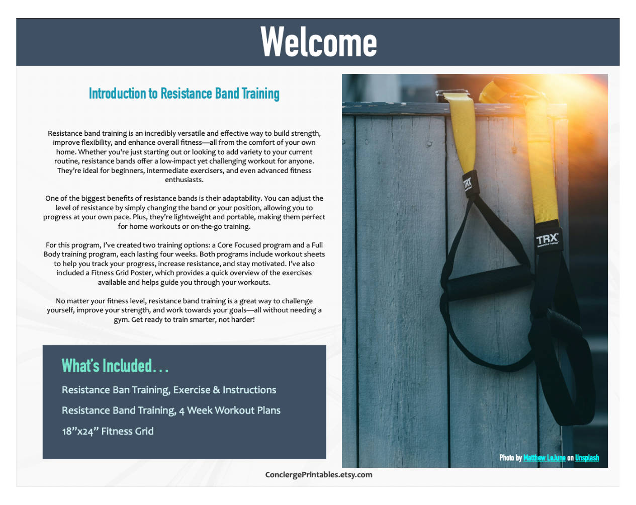 The Resistance Band Workout Booklet was created as a digital fitness resource for Concierge Printables’ Etsy store. The goal was to make a comprehensive, beginner-friendly program that promoted flexibility and personalization—especially for families or individuals who wanted low-impact strength training.