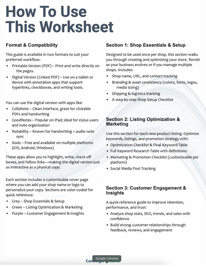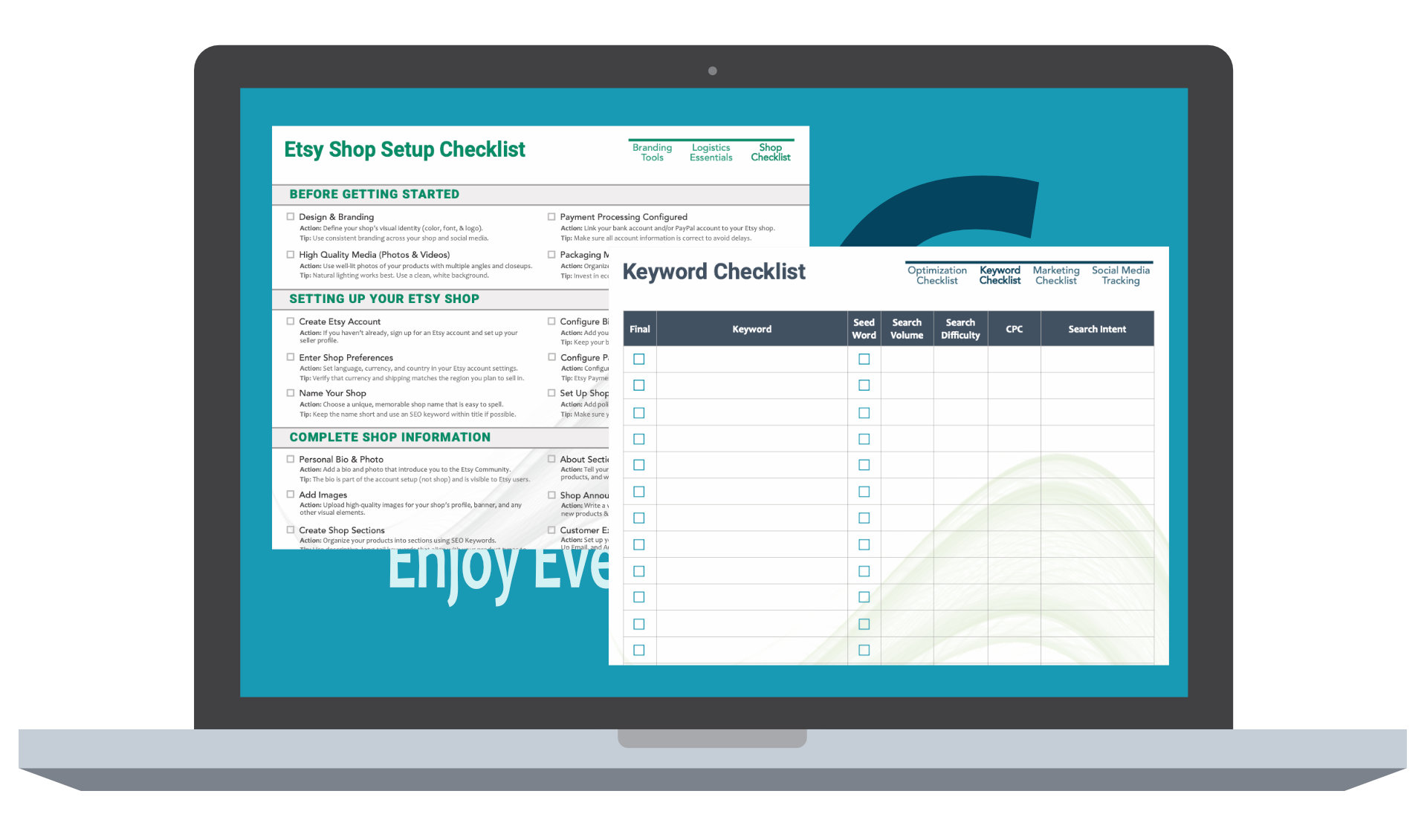 A digital resource to help Etsy sellers structure, optimize, and maintain their shop and product listings.