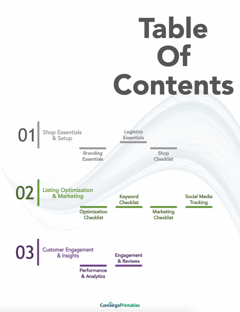 Concierge Printables needed a structured resource to help Etsy sellers improve visibility and professionalism in their online shops. I created the digital booklet Etsy Success: Shop & Listing Optimization Checklist, a detailed guide covering shop setup, product optimization, marketing, and customer engagement. While designed for Etsy, the framework applies to most online marketplaces with minimal adjustments.