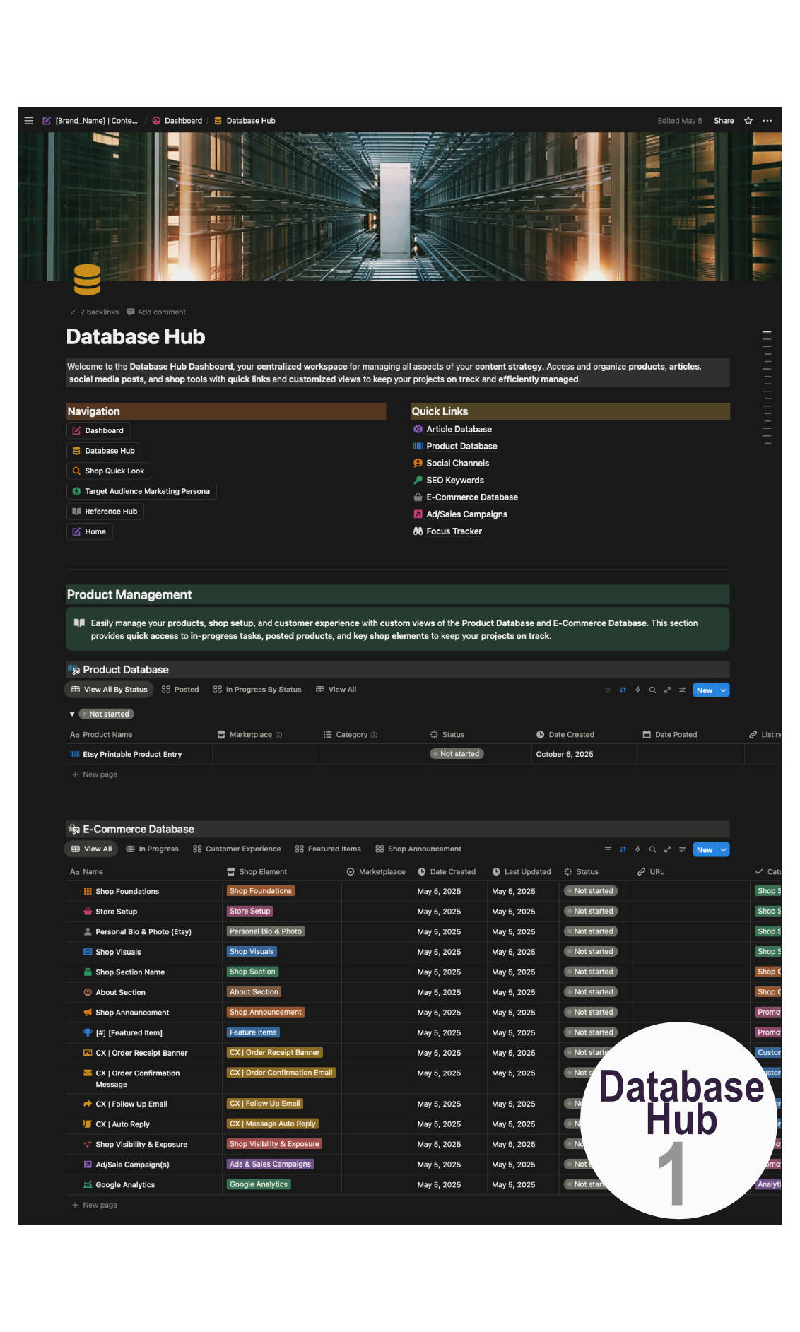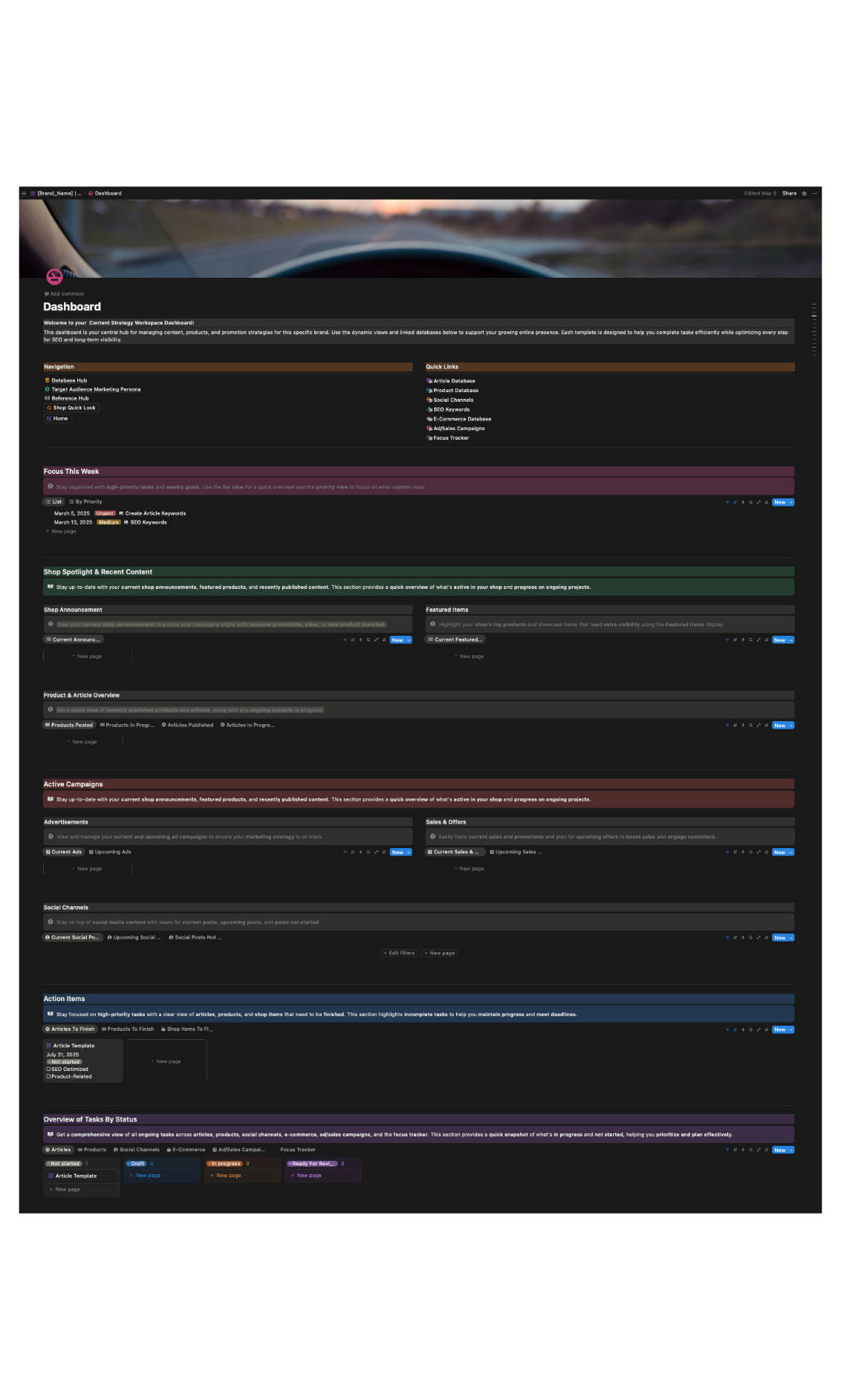 A centralized Notion workspace to manage and streamline the full marketing cycle—from product creation to optimization, article writing, and social media execution.