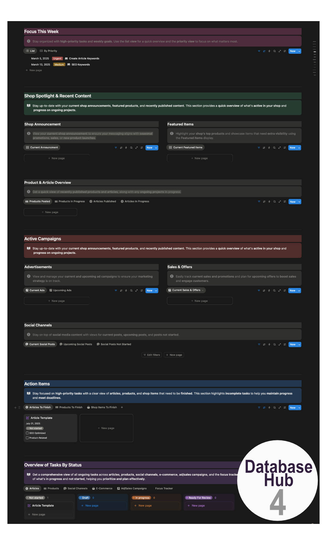 Each database was designed with its own tailored templates—for example, the Social Channels database features templates for Facebook, Pinterest, Instagram, and LinkedIn, while the Product and Article databases guide users through optimized content creation.